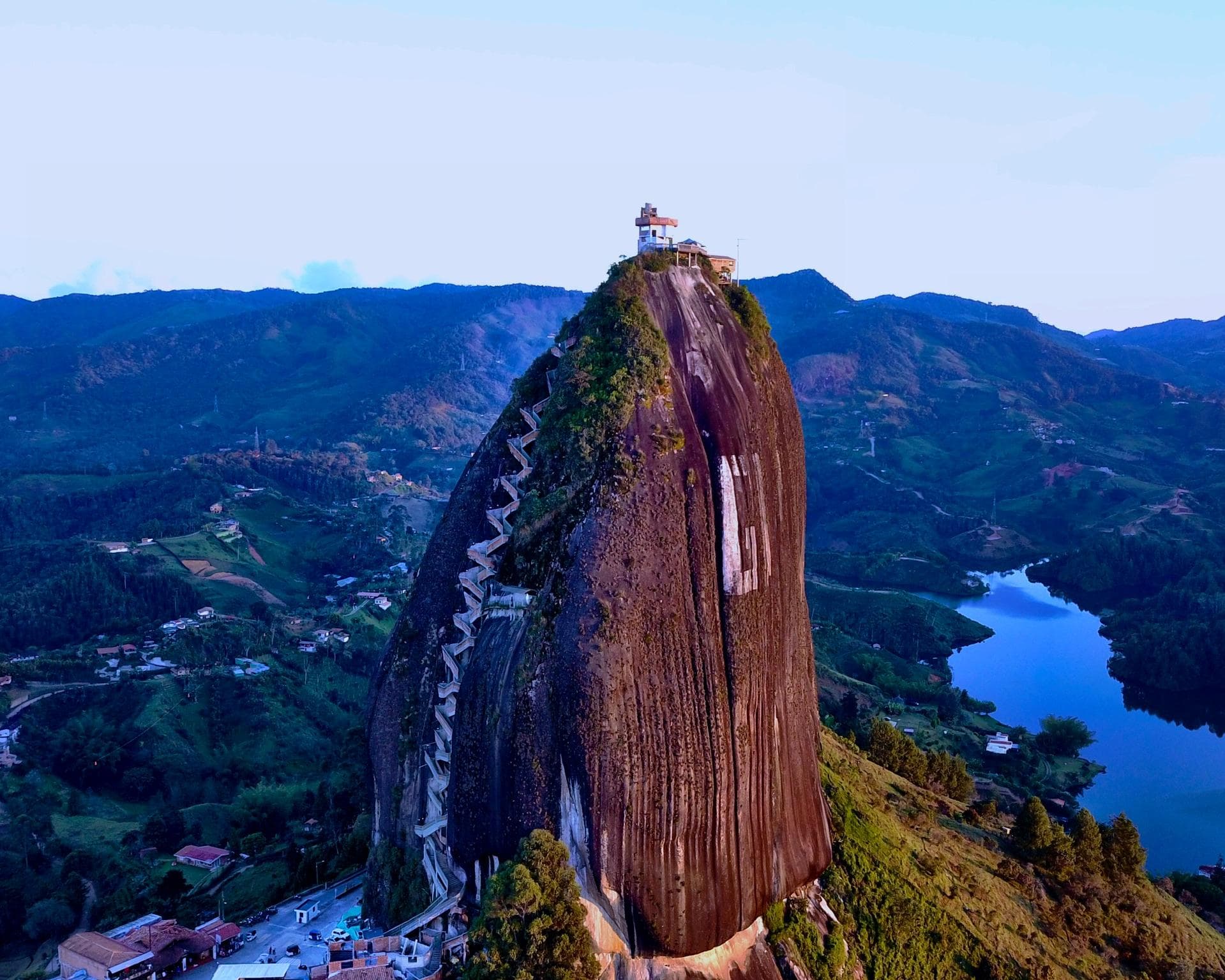 A la hora indicada, salida desde el punto de encuentro, hacia la impresionante Piedra del Peñol, situada a 75 km de Medellín. Esta majestuosa formación rocosa se eleva 220 metros sobre una represa crucial para la generación de energía en el país. Los aventureros podrán optar por ascender los 702 escalones que llevan a la cima, donde se ofrece una vista panorámica sobre los municipios de Guatapé y El Peñol (entrada no incluida).