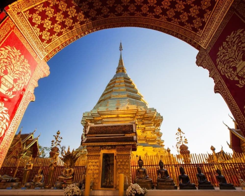 A la hora indicada, salida en dirección a Chiang Mai, conocida como la Rosa del Norte y la ciudad más relevante de la región, cuyo origen se remonta al Reino Lanna del siglo XIII. En el trayecto, realizaremos una parada para admirar el icónico templo blanco de Wat Rongkhun, una obra arquitectónica única. Continuamos hacia Chiang Mai, donde visitaremos el templo de Doi Suthep, situado a 1.053 metros de altura, un lugar emblemático y de gran relevancia como centro de peregrinación. Después del almuerzo, exploraremos el centro de artesanías local, famoso por la elaboración de joyas, piedras preciosas, seda, sombrillas, tallas de madera y muebles de teca. Alojamiento.
